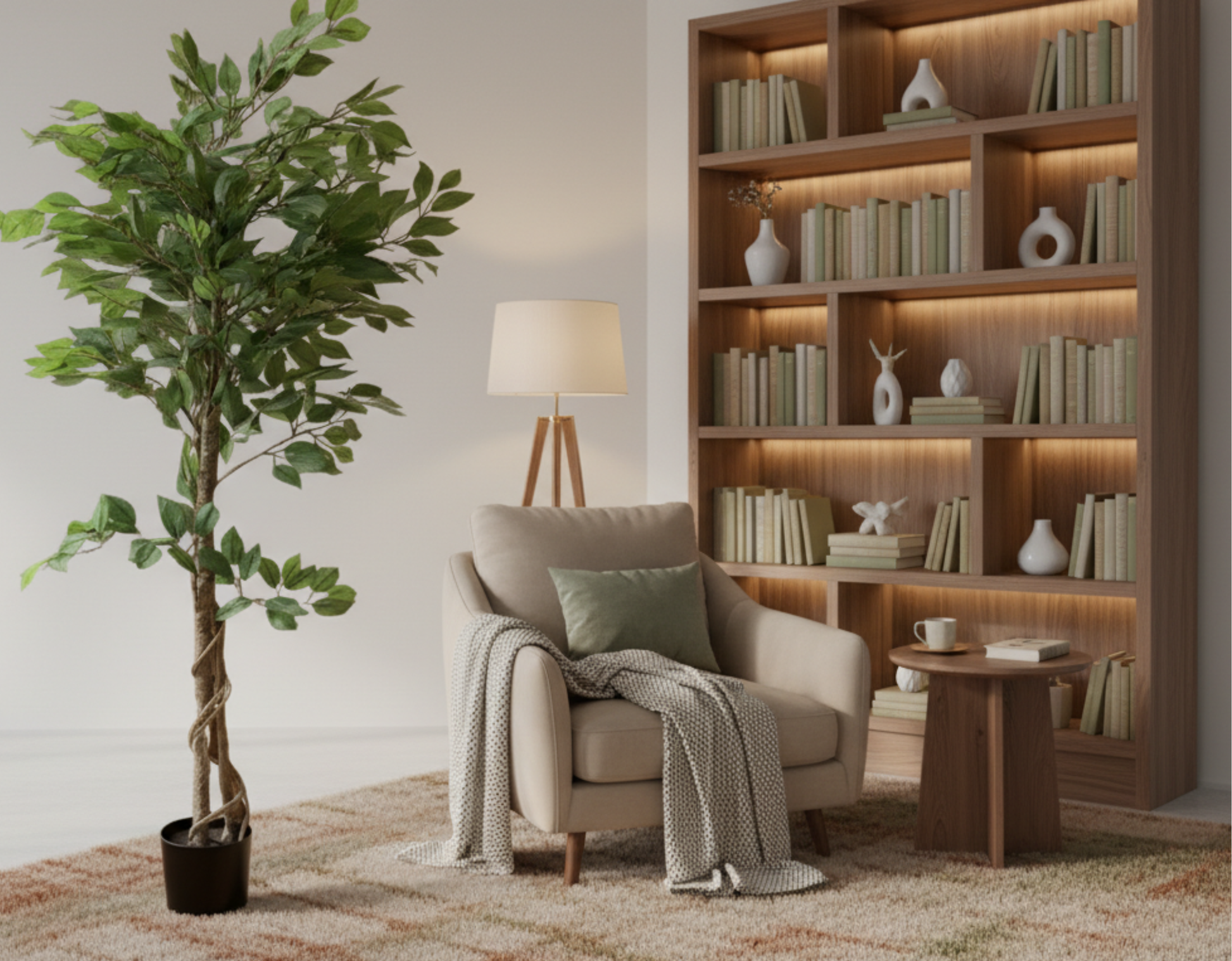 Whether placed beside a sofa, near a window, in a reading corner, or at your entryway, this artificial ficus tree instantly brings warmth, sophistication, and greenery to your décor.