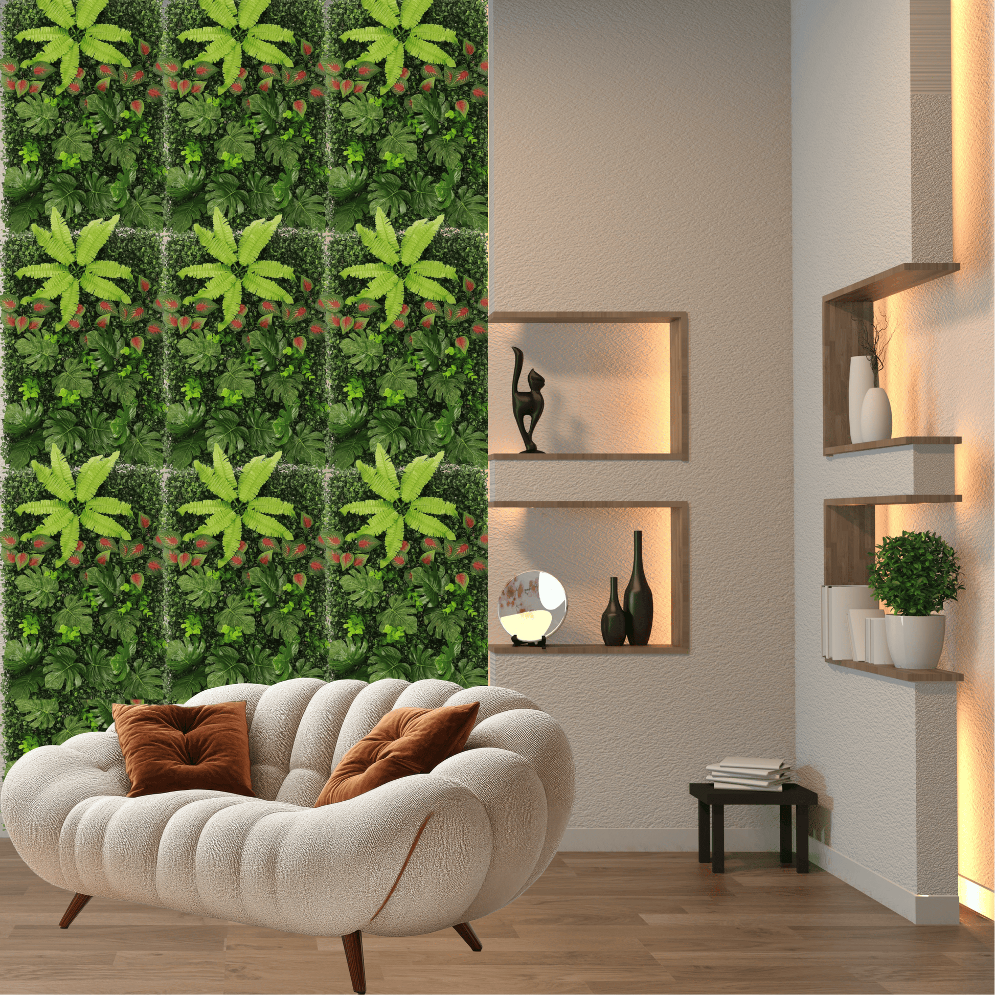 Features a lush mix of fern, monstera, caladium, and boxwood-style leaves, creating a vibrant, natural-looking greenery wall that instantly refreshes any space.
