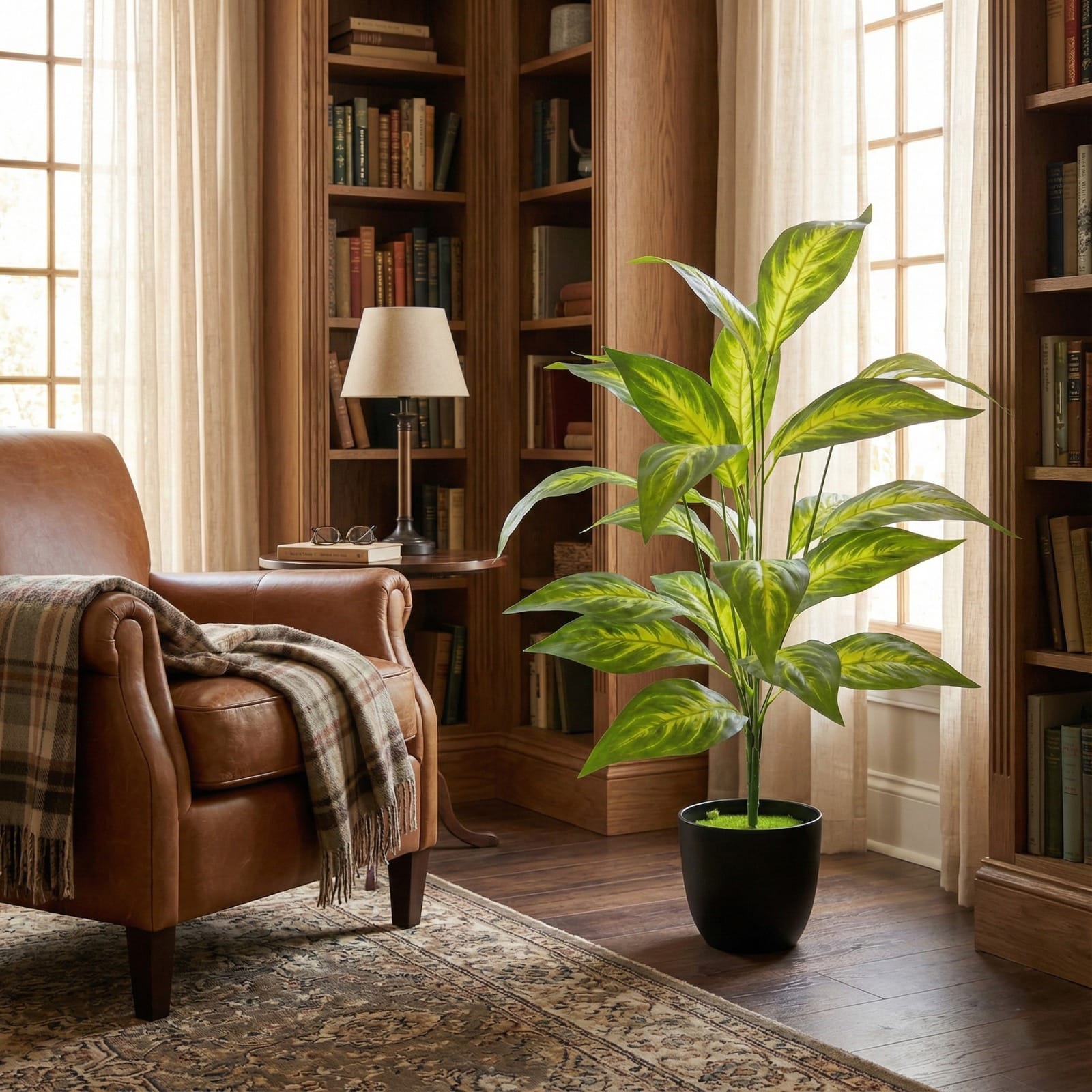 Crafted from high-quality plastic, the leaves feature detailed textures and lifelike green tones for a realistic appearance. The plant comes pre-potted in a sturdy black pot, making it ready to display straight out of the box. Its slim, balanced design allows easy placement on floors, tables, shelves, or corners.