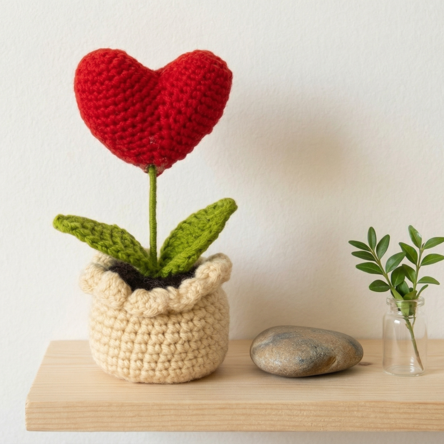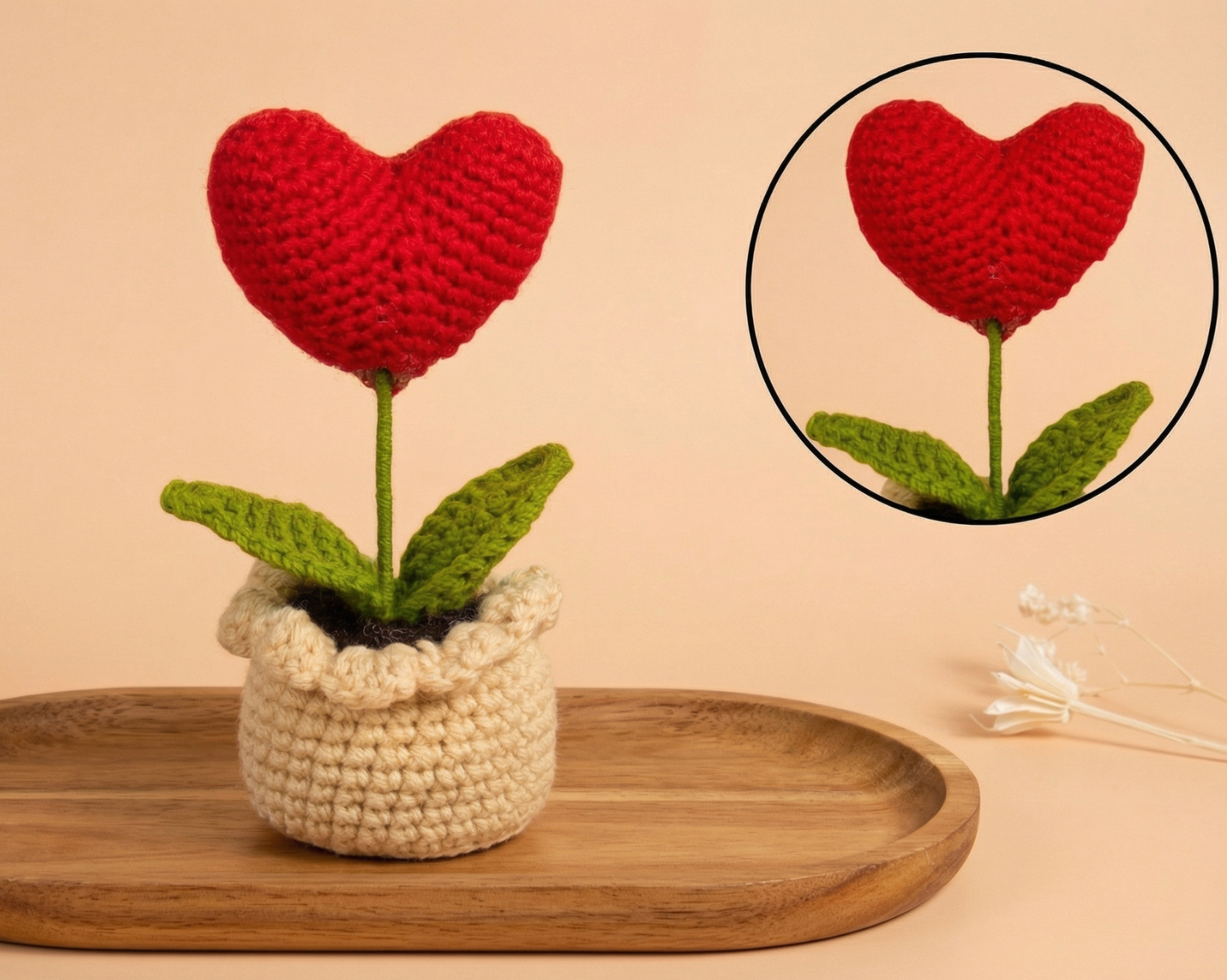 Carefully handmade using quality yarn, this decorative flower offers the beauty of blooms without any maintenance. Its compact 6-inch height makes it perfect for desks, shelves, bedside tables, and cozy corners, while the elegant heart design makes it ideal for romantic and gift-worthy occasions.