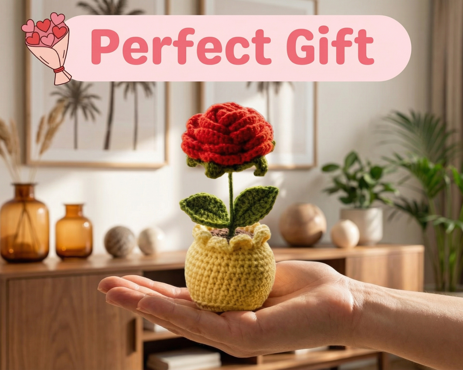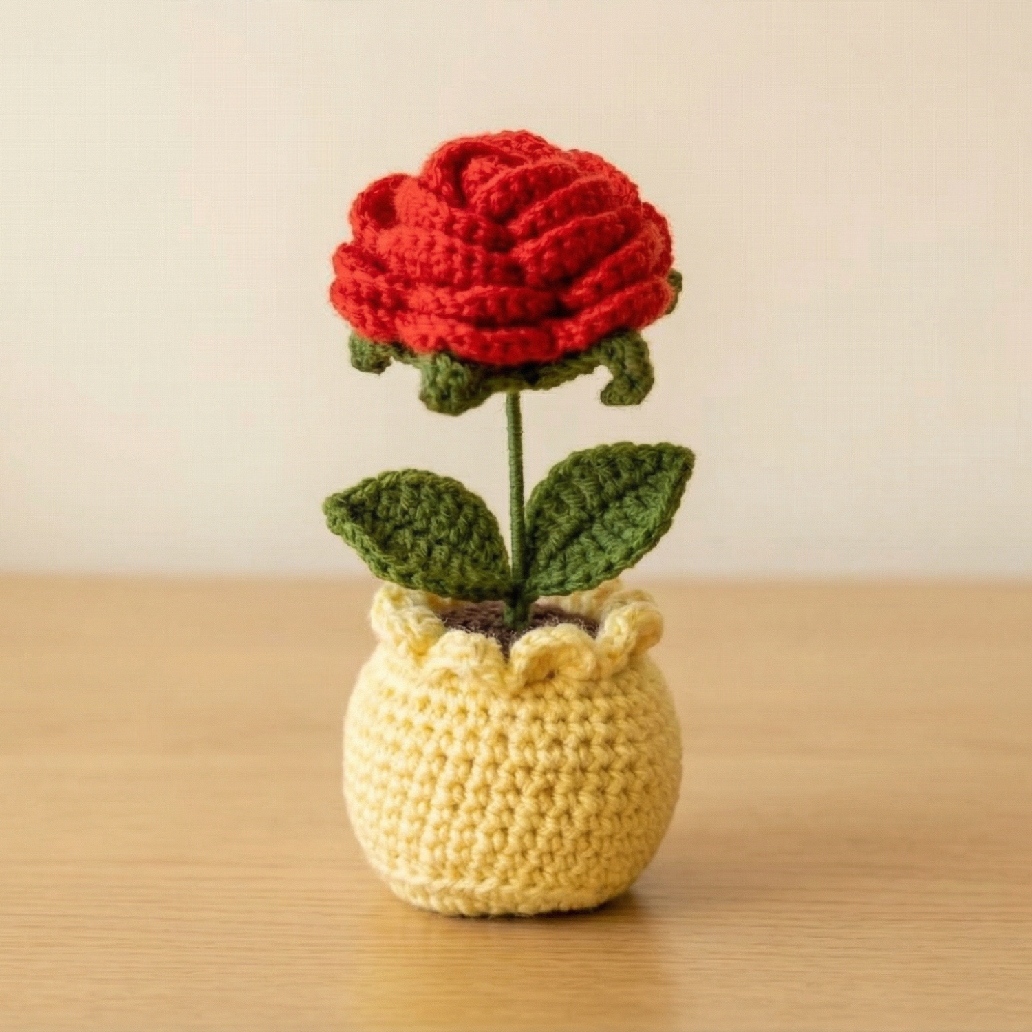 The rich red crochet rose, paired with soft green leaves and a neatly woven yarn pot, creates a graceful tabletop accent perfect for desks, shelves, bedside tables, and cozy corners. With a compact 6-inch height, it fits effortlessly into small spaces while still making a striking visual impression.