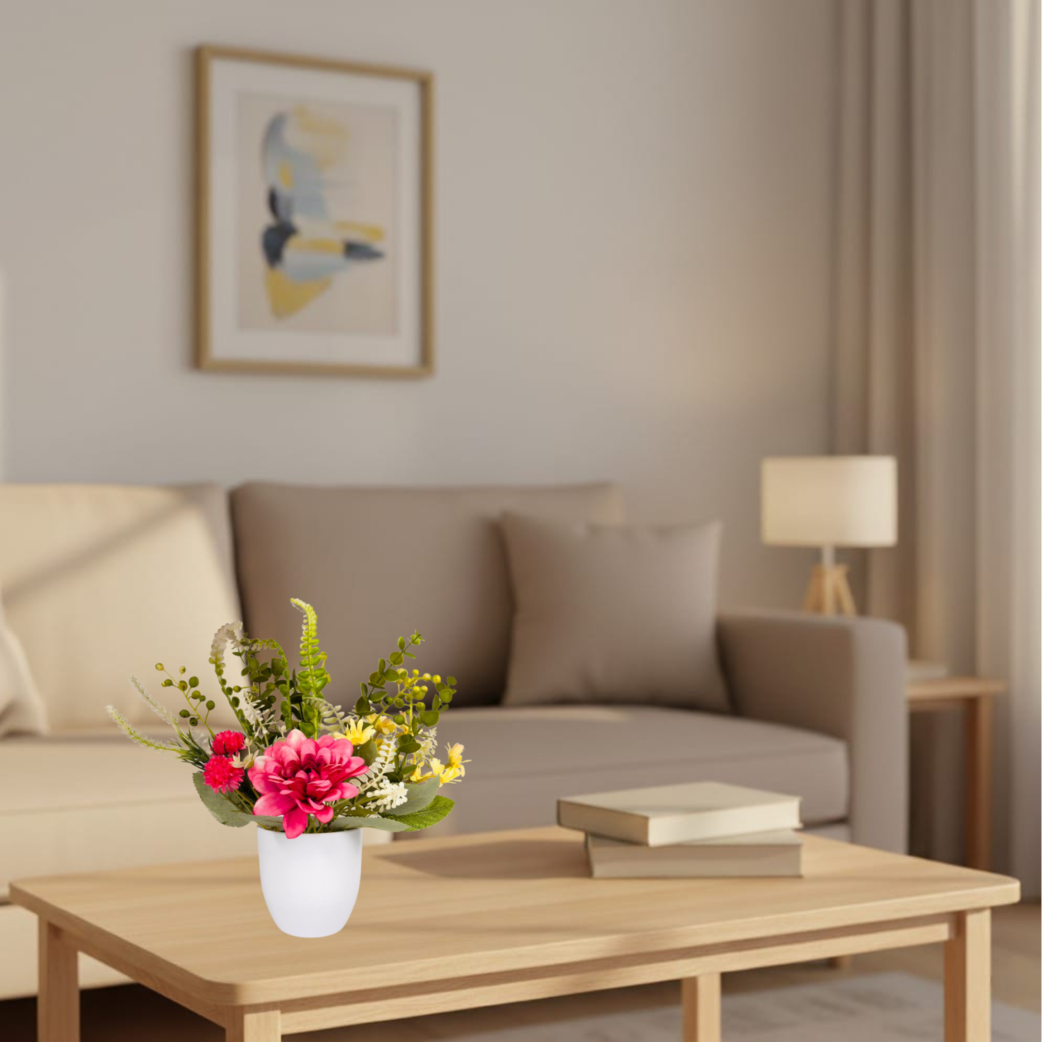 Bring effortless elegance into your home with the Dekorly Premium Faux Flower Chrysanthemum Arrangement. Standing at 28 cm (11 inches) tall, this stunning display features a vibrant mix of burgundy and yellow chrysanthemum blooms, complemented by lush greenery and lifelike foliage. Beautifully arranged in a sleek white ceramic-style vase, it adds a touch of sophistication to any room—without the need for watering or maintenance. Crafted with high-quality, realistic materials, each petal and leaf is designed to mimic the look and feel of fresh flowers. Perfect for living rooms, bedrooms, offices, entryways, or special event décor, this elegant arrangement makes a charming accent piece that brightens any space. ✨ Why You’ll Love It 1. Premium, real-touch faux chrysanthemum flowers 2. Beautiful burgundy & yellow bloom mix with rich greenery 3. Stylish white vase included – ready to display straight out of the box 4. Durable, long-lasting, maintenance-free design 5. Ideal for home décor, office desks, shelves, dining tables, and gifts Transform your space with color and elegance—Dekorly makes decorating effortless.